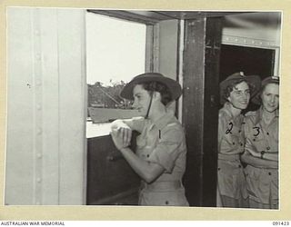 LAE, NEW GUINEA. 1945-05-07. PRIVATE L. LOBB, TAKING HER FIRST GLIMPSE OF NEW GUINEA FROM THE MV DUNTROON, BEFORE DISEMBARKING BY LANDING BARGE AT MILFORD HAVEN, EN ROUTE TO THE AWAS BARRACKS AT ..