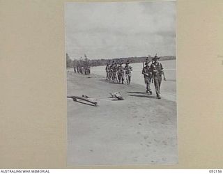 WEWAK AREA, NEW GUINEA, 1945-06-11. MEMBERS OF 2/8 INFANTRY BATTALION CARRYING BED POLES AS THEY ADVANCE TO NEW POSITIONS ON HILL 2 DURING ACTIVITIES OF THEIR UNIT IN THE WEWAK AREA. THE BED POLES ..