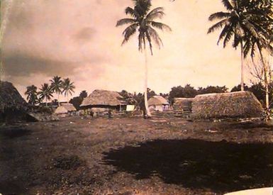 - Village Scene, 1890-1910, Sāmoa, by Thomas Andrew. Purchased 1950. Te Papa (O.002235). View, from a cleared area, looking at a line of grass-roofed huts. Three palm trees are visible in the middle of the image, there are four other palm trees in the background. In the foreground (at right) is a patch of land cast in shadow. 140, 200