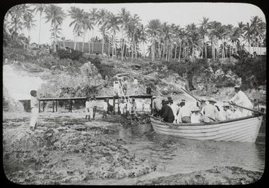 - Landing at Savage Island, Niue, by Henry Winkelmann. Te Papa (LS.005256). Number 75 - view of rowboat at right (with the new arrivals), a line of palm trees is visible on hillside in the background. 8, 8