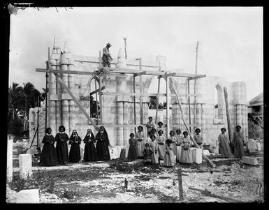 - Nuku'alofa. Roman Catholic Mission. The Coral Church, 29 July 1884, New Zealand, by Burton Brothers, Alfred Burton. Purchased 1943. Te Papa (C.016833). Building site with scaffolding (man stands on top, centre) and facade of building behind. In front to right five nuns stand in a row, to left of them a group of children (thirteen) stand in three rows, two more children stand separately off to the left.