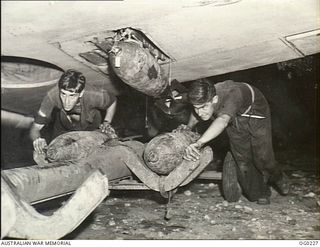 VIVIGANI, GOODENOUGH ISLAND, PAPUA. 1943-11-02. RAAF KITTYHAWK PILOTS ARE FLYING THEIR SINGLE ENGINE AIRCRAFT OVER MILES OF SEA TO DIVE BOMB NEW BRITAIN. THESE ARMOURERS WORKED THROUGH THE NIGHT TO ..