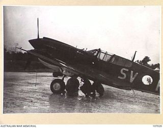 KIRIWINA, TROBRIAND ISLANDS, PAPUA. C. 1944-02. GROUND CREW OF NO. 76 (KITTYHAWK) SQUADRON RAAF TAKE SHELTER FROM THE RAIN IN ONE OF THE SUDDEN TROPICAL DOWNPOURS UNDER THE WING OF THE AIRCRAFT, ..