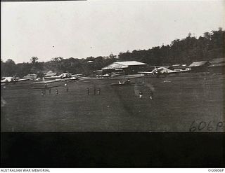 Lae, New Guinea. 1937. Aerial view of hangars and aircraft at the airfield at Lae, used by Guinea Airways