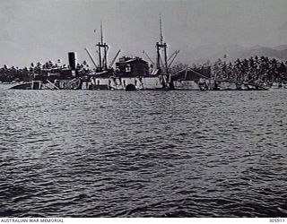 MILNE BAY, PAPUA. 1943. VIEW OF THE HARBOUR WITH THE DUTCH TRANSPORT BANTAM BERTHED ALONGSIDE THE WRECK OF THE ANSHUN, SUNK BY JAPANESE NAVAL UNITS DURING THE BATTLE OF MILNE BAY IN 1942-09. THE ..