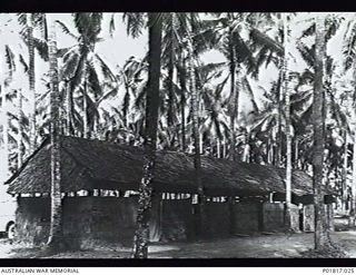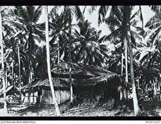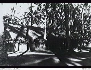 Milne Bay, Papua, 1944-03. General view of the base occupied by the Headquarters (HQ) of RAAF Northern Command. A road winds between palm-roofed huts which serve variously as administrative and ..
