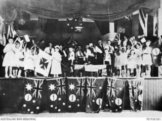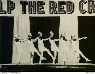 Port Moresby, Papua. 1940-09-12. Some of the cast of the amateur Sunny Side Up Company patriotic concert party, providing entertainment in aid of the Red Cross, on stage following a performance at ..