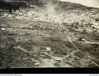 Rabaul, New Britain. 1943-11-02. Aerial photograph of shipping in the harbour and smoke rising from the town, during an air attack by seventy-five Mitchell aircraft covered by Lightnings of the ..