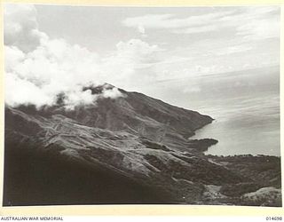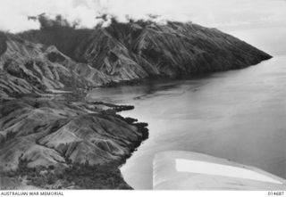 1943-04-20. NEW GUINEA. MILNE BAY. HILLS FALL SHEER TO THE WATER AND ARE COVERED WITH KUNAI GRASS FROM THREE TO TEN FEET HIGH. THE HILL SLOPES WERE LITTERED WITH THE BODIES OF JAPANESE WHO TRIED TO ..