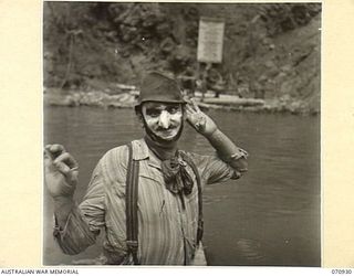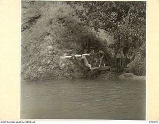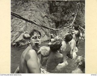 ZENAG, NEW GUINEA, 1944-02-27. A SPORTS CARNIVAL HELD IN A CREEK DAMMED BY PERSONNEL OF THE 2/9TH FIELD COMPANY, ROYAL AUSTRALIAN ENGINEERS. THESE COMPETITORS IN THE "BUN AND TREACLE" RACE, ..