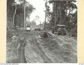 WAU - LAE ROAD, NEW GUINEA, 1944-03-10. AUSTRALIAN NEW GUINEA ADMINISTRATIVE UNIT NATIVES LOADING GRAVEL FROM THE BANKS OF THE MARKHAM RIVER 86.5 MILES FROM WAU INTO TIP TRUCKS FOR USE ON SURFACING ..