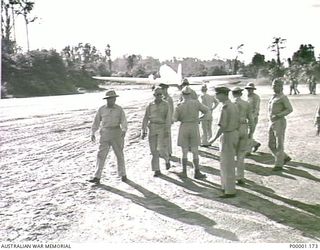 THE SOLOMON ISLANDS, 1945. US AND ALLIED OFFICERS WAVE FAREWELL AS AMERICAN MAJOR GENERAL R.J. MITCHELL'S C47 AIRCRAFT MOVES OUT FOR TAKEOFF ON THE GENERAL'S DEPARTURE FROM BOUGAINVILLE ISLAND