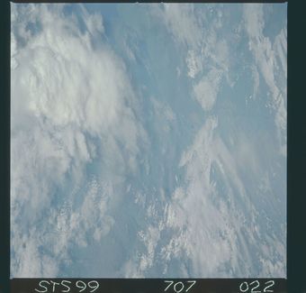 - The original finding aid described this as: Description: ``Earth observation views taken from Endeavour, Orbital Vehicle (OV) 105, during the STS-99 mission.`` Subject Terms: STS-99,EARTH OBSERVATIONS (FROM SPACE) Date Taken: 3/14/2000 Categories: Earth Observations Interior_Exterior: Exterior Ground_Orbit: On-orbit Original: Film - 70MM CT Pres...