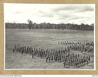 WONDECLA, QLD. 1944-04-15. GENERAL VIEW OF THE PARADE OF THE 2/1ST INFANTRY BATTALION, IN CLOSE COLUMN, STANDING AT ATTENTION, ON THE HERBERTON RACECOURSE. TAKING THE PARADE IS THE COMMANDING ..