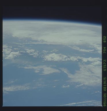 - The original finding aid described this as: Description: Earth observations taken from shuttle orbiter Columbia during STS-73 mission. Subject Terms: STS-73 EARTH OBSERVATIONS (FROM SPACE) Date Taken: 11/1/1995 Categories: Earth Observations Interior_Exterior: Exterior Ground_Orbit: On-orbit Original: Film - 70MM CT Preservation File Format: TIF...