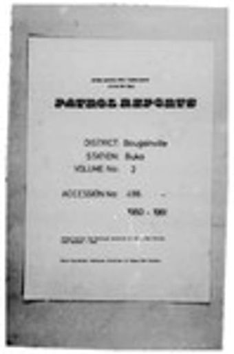 - Approximately 12 patrol reports, with related correspondence. Cover sheet indicates that vol. 1 includes reports from 1957-1960, but only reports from 1957-1958 are present. PATROL OFFICERS: Leake, T. W.; Kimmorley, C. W.; McCabe, B. A.; Robson, A. C.; Atkinson, K. C. AREAS PATROLLED: Sailo, Teop, Nissan, Numa Numa, Sohano, Carteret, Mortlock, T... Bougainville Province (Papua New Guinea)Pacific IslandsBuka (Papua New Guinea)MelanesiaOceania