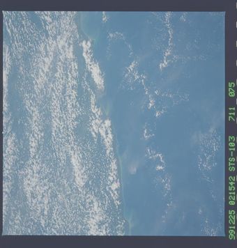 - The original finding aid described this as: Description: Earth observations taken during the STS-103 mission from the space shuttle Discovery. Subject Terms: EARTH OBSERVATIONS (FROM SPACE), STS-103 Date Taken: 12/25/1999 Categories: Earth Observations Interior_Exterior: Exterior Ground_Orbit: On-orbit Original: Film - 70MM CT Preservation File ...