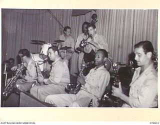 LAE, NEW GUINEA. 1944-07-24. A MEMBER OF THE AMERICAN SPECIAL SERVICES BAND PLAYS A SAXOPHONE SOLO DURING A CONCERT FOR THE TROOPS BY THE JACK BENNY SHOW