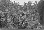 Pig festival, uprooting cordyline ritual, Tsembaga: taking uprooted plant to enemy boundary, decorated men pound drums, group in distance approaches