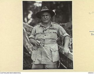 BOUGAINVILLE. 1945-03-26. GENERAL SIR THOMAS A. BLAMEY, COMMANDER-IN-CHIEF, ALLIED LAND FORCES, SOUTH WEST PACIFIC AREA (4), WITH A GROUP OF SENIOR OFFICERS AT ADVANCED HEADQUARTERS 7 INFANTRY ..
