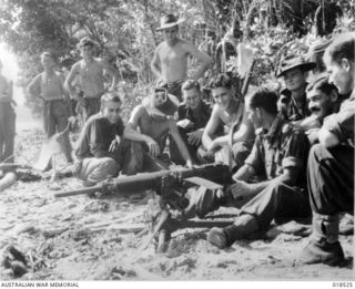 WEWAK, NEW GUINEA. 1945-05-10. TROOPS OF 2/4 INFANTRY BATTALION WITH CAPTURED JAPANESE TYPE 92 "WOODPECKER" MACHINE-GUN. WEWAK HARBOUR IS IN THE BACKGROUND. IDENTIFIED PERSONNEL ARE:- PRIVATE R.J. ..