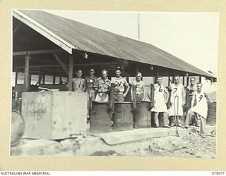 CAPE WOM, WEWAK AREA, NEW GUINEA. 1945-08-28. SERGEANT M.J. LAWRENCE, 104 CASUALTY CLEARING STATION PREPARING MEAT IN THE HOSPITAL KITCHEN FOR PATIENTS