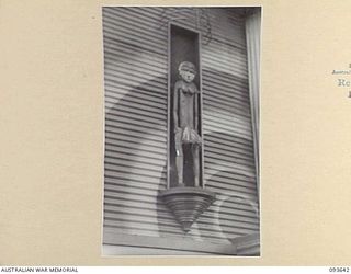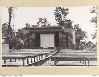 MALMAL VILLAGE, JACQUINOT BAY, 1945-07-03. A NATIVE CARVED MALE FIGURE, PLACED IN THE RIGHT HAND PANEL OF THE NEWLY COMPLETED THEATRE STAGE AT HEADQUARTERS 5 DIVISION. THE THEATRE WAS DESIGNED ON ..