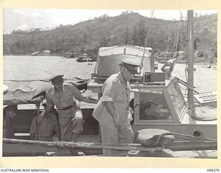 RABAUL, NEW BRITAIN. 1945-10-27. GENERAL SIR THOMAS A. BLAMEY, COMMANDER-IN-CHIEF, ALLIED LAND FORCES, SOUTH WEST PACIFIC AREA (2), AND MEMBERS OF THE OFFICIAL PARTY LEAVING BURNS PHILP WHARF. ..
