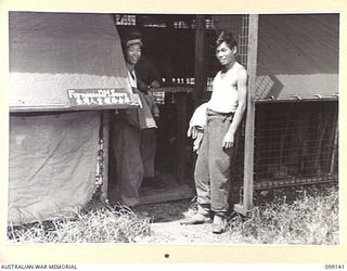 LAE, NEW GUINEA. 1945-11-3. THE CAMP ORDERLY ROOM AND THE PRISONER OF WAR TENT LINES, AT NO 3 DETACHMENT, 20 PRISONER OF WAR CAMP, LAE