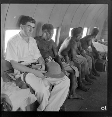 Reverend Keleher and local people on a Qantas Empire Airways' flight to Manus Island, Admiralty Islands, Bismarck Archipelago, Papua New Guinea