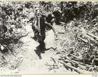 BOUGAINVILLE ISLAND. 1944-11-25. AUSTRALIAN NEW GUINEA ADMINISTRATIVE UNIT NATIVE CARRIERS CLIMBING THE WINDING SISIVA TRAIL WITH AMMUNITION AND WEAPONS FOR A COMPANY, 9TH INFANTRY BATTALION WHICH ..