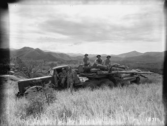 - Unidentified World War II soldiers at the main divisional ordnance workshops at (Moindah? possibly Moindou?), New Caledonia, 1943. Photographer unidentified. Quantity: 1 b&w original negative(s). Physical Description: Film negative