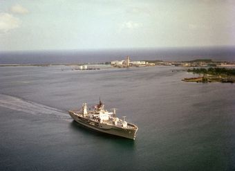 The amphibious command ship USS BLUE RIDGE (LCC 19) enters the harbor