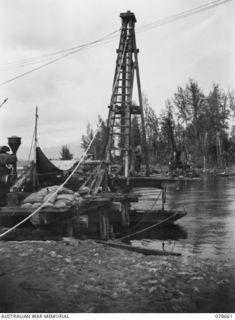 MOTUPENA POINT, BOUGAINVILLE ISLAND, 1945-01-26. SAPPERS OF THE 23RD FIELD COMPANY, WORKING ON THE CONSTRUCTION OF A NEW TIMBER PILE BRIDGE OVER THE JABA RIVER