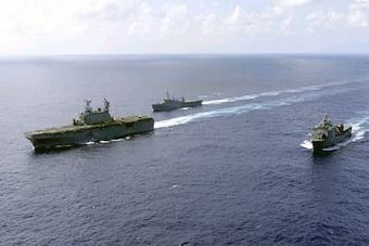 Crew members aboard the amphibious assault ship USS GUAM (LPH-9) prepare to transfer replenishment hoses to the tank landing ship USS LA MOURE COUNTY (LST-1194) as the two vessels are readied for an underway replenishment operation