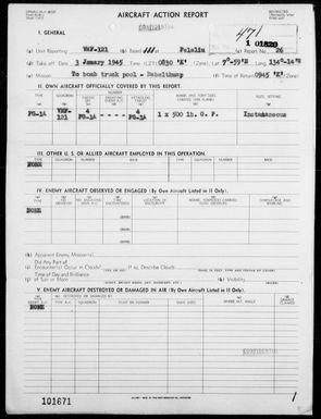 VMF-121 - ACA Report #26 - Bombing & Strafing Truck Pool on Babelthuap Island, Palau Islands on 1/3/45
