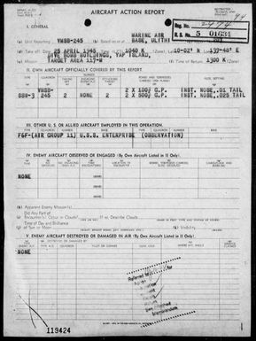 VMSB-245 - ACA report #207 - Bombing targets in the Yap Area, Carolines on 4/25/45