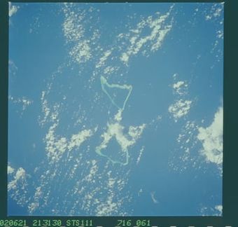 - The original finding aid described this as: Description: Earth observation views taken during mission STS-111 UF-2. Subject Terms: EARTH OBSERVATION (FROM SPACE) Date Taken: 6/21/2002 Categories: Earth Observations Interior_Exterior: Exterior Ground_Orbit: On-orbit Original: Film - 70MM CT Preservation File Format: TIFF geon: MARSHALL ISLANDS fe...