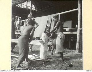 KAKAKOG, NEW GUINEA. 1944-06-27. NATIVE LABOURERS WORKING UNDER THE DIRECTION OF THE AUSTRALIAN NEW GUINEA ADMINISTRATIVE UNIT CONSTRUCT A HUT