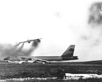 Right front view of a B-52D Stratofortress aircraft from Strategic Air Command taking off for a mission over North Vietnam during Operation LINEBACKER