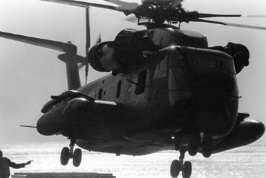 A CH-53 Sea Stallion helicopter takes off from the flight deck of the amphibious assault ship USS GUAM (LPH 9), during operations off the coast of Beirut, Lebanon