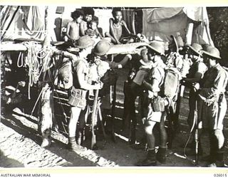 PAPUA, NEW GUINEA. 1942-07-20. AUSTRALIAN TROOPS RETURNING FROM A PATROL THROUGH A NATIVE VILLAGE