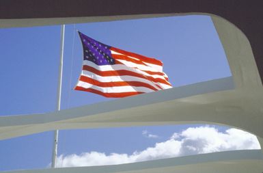 A flag flies at half-mast atop the USS ARIZONA (BB-39) Memorial to commemorate the 43rd anniversary of the Japanese attack