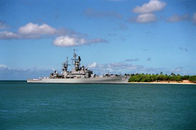 The guided missile cruiser USS GRIDLEY (CG-21) enters the channel as it arrives for a visit to Naval Station, Pearl Harbor, Hawaii.