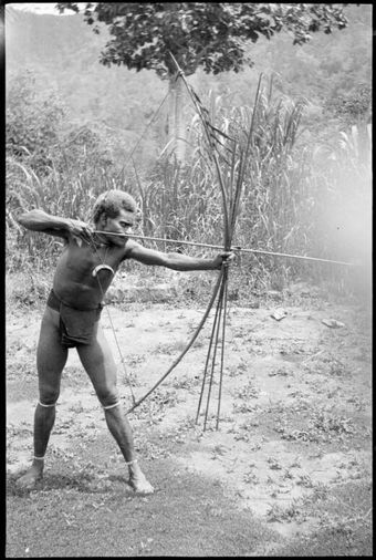 Manau from Aitape, the Chinnery's house boy firing a bow and arrow, Rabaul, New Guinea, ca. 1935 / Sarah Chinnery