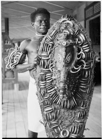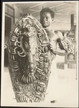 Man with two large sago pots brought to Awar plantation trade store, Awar, Sepik River, New Guinea, 1935 / Sarah Chinnery