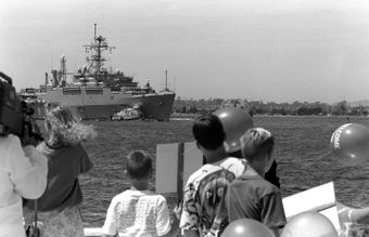 A port beam view of the Third Fleet flagship USS CORONADO (AGF-11) departing Pearl Harbor through the channel.