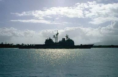 A starboard beam view of the guided missile cruiser USS CHOSIN (CG-65) underway in the channel as it arrives at the naval station.