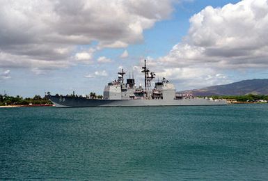 Crew members man the rails aboard the guided missile cruiser USS PRINCETON (CG 59).
