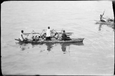 Outrigger canoe laden with produce and three women as crew, Rabaul, New Guinea, ca. 1929, 1 / Sarah Chinnery